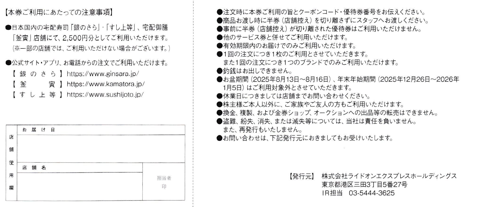 宅配寿司「銀のさら」・「すし上等!」、宅配御膳「釜寅」店舗にて2,500円分として利用できます。
