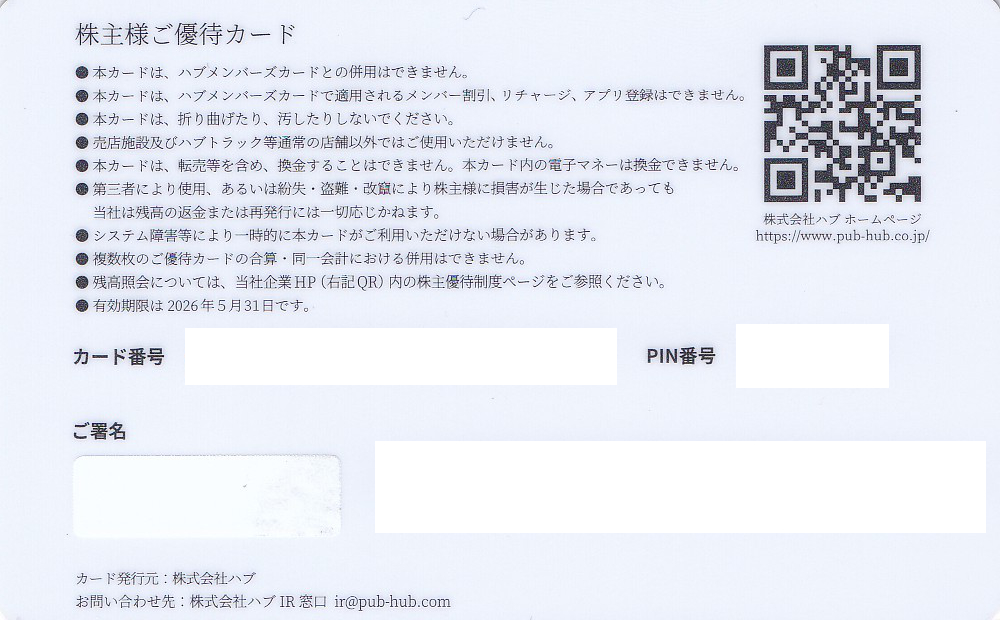 ハブ(HUB)株主優待カード(2,000円)(2026.5.31)