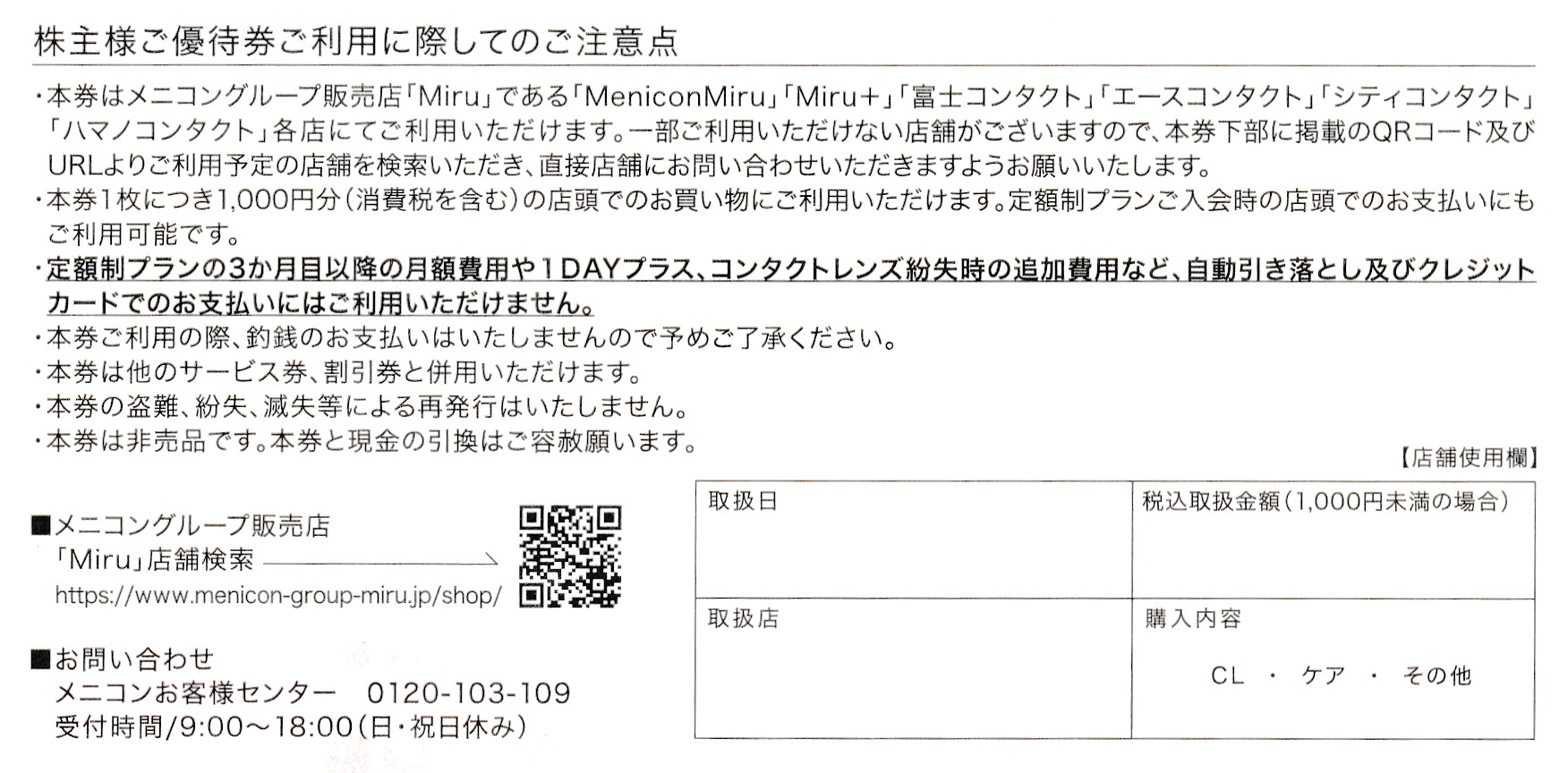 メニコン株主優待券(1,000円券)(2026.8.31)