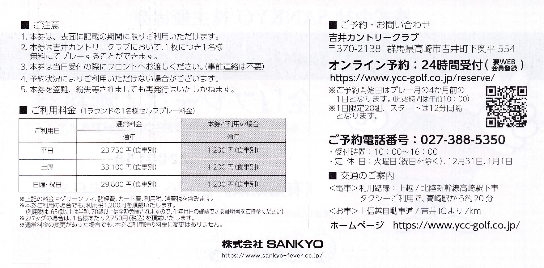 吉井カントリークラブ・プレーフィー(全日プレーフィ無料券)(SANKYO株主優待券)(2026.2)
