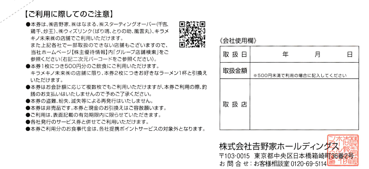 会計金額に応じて、株主優待券を複数枚利用ができますが、お釣りは出ません。