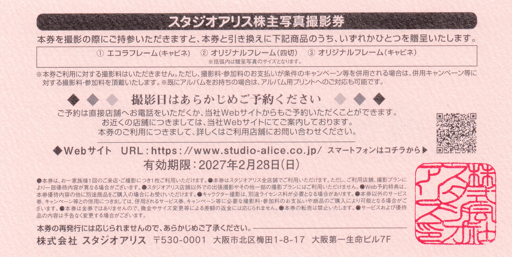 スタジオアリス株主優待券(写真撮影券)(2027.2.28)