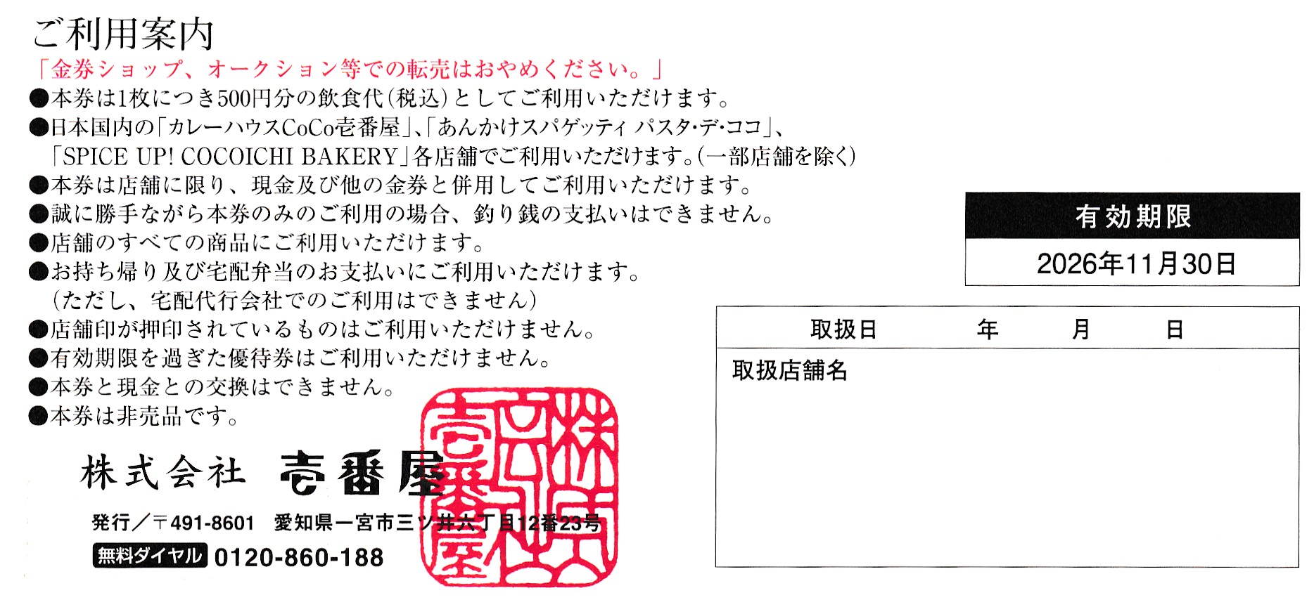 CoCo壱番屋株主優待券(500円券)(2026.11.30)