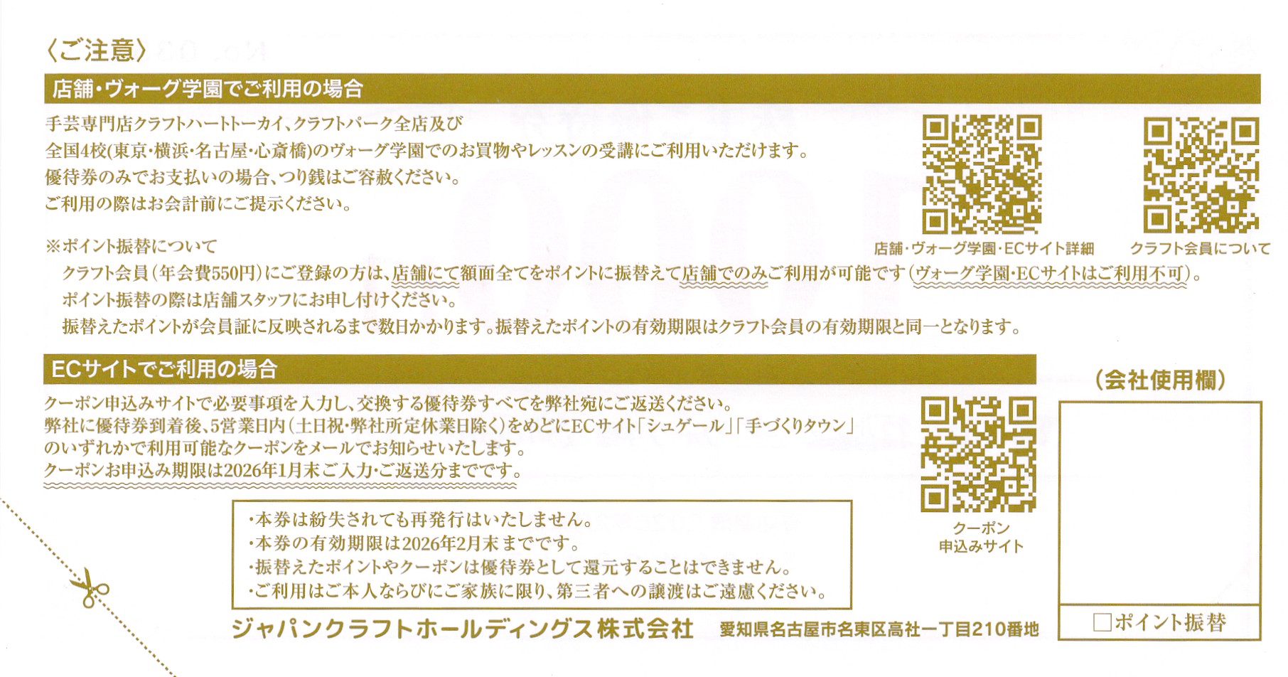 クラフトハートトーカイ(ジャパンクラフト)株主優待券(1000円券)(2026.2)
