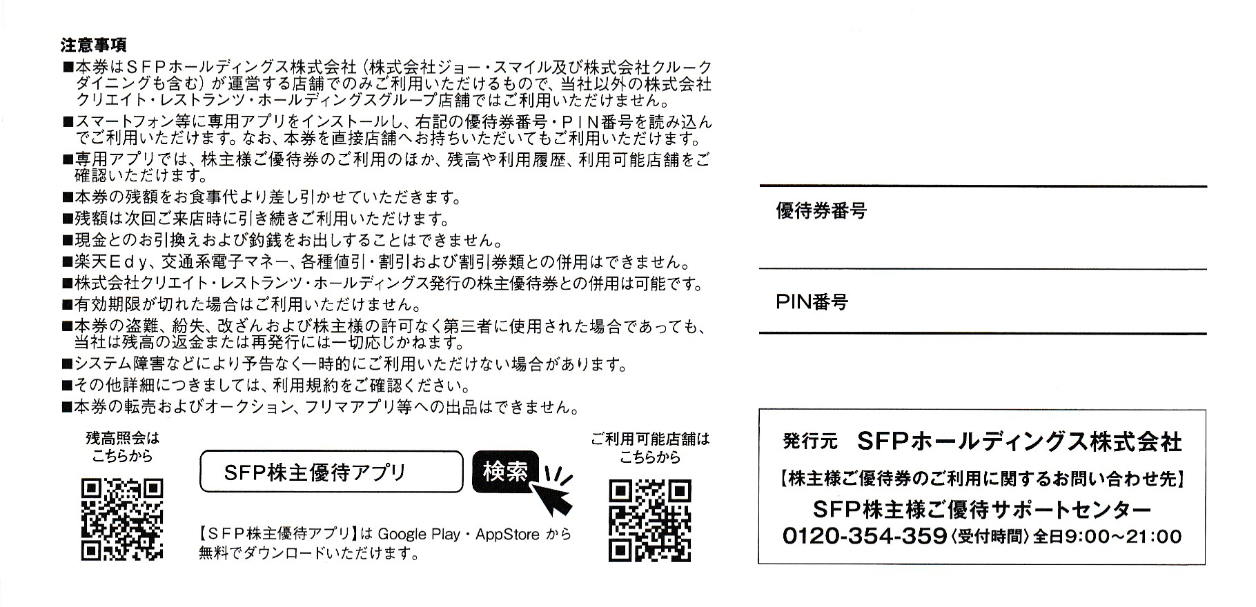 スマホアプリに優待券番号・PIN番号を登録して利用、または優待券を直接店舗にて利用いただけます。