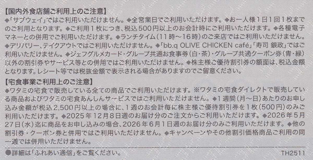 ワタミ株主優待券(500円券)(バラ売)(2026.5.31)