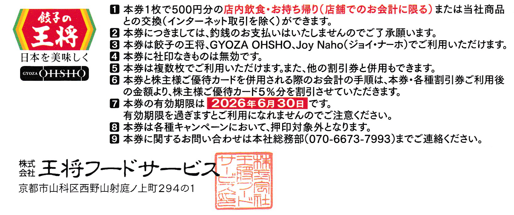餃子の王将(王将フードサービス)株主優待券(500円券)(2026.6.30)
