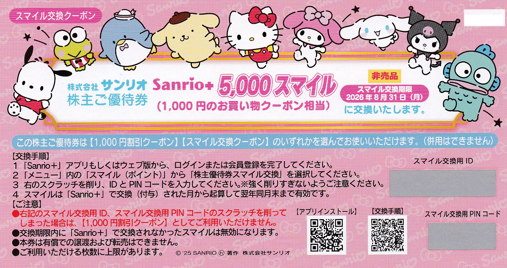 サンリオ株主優待券(1,000円)(2026.8.31)