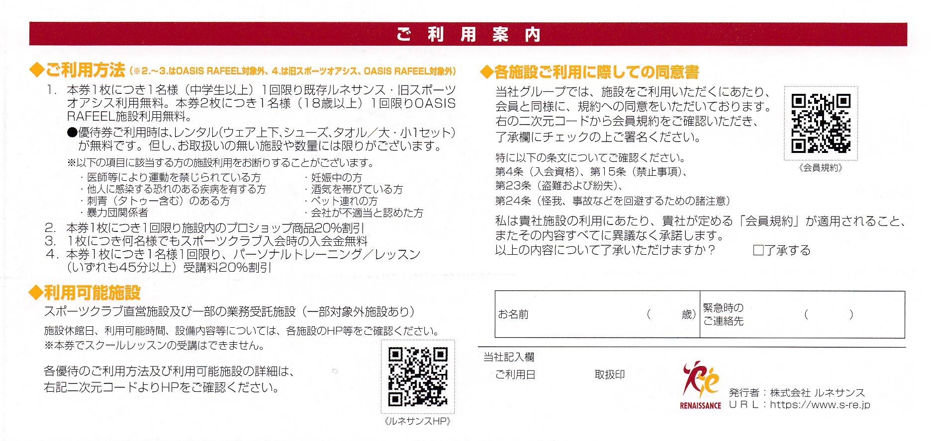 ・株主優待券1枚につき1名(中学生以上)が、1回限り既存ルネサンスまたは旧オアシスの施設利用無料