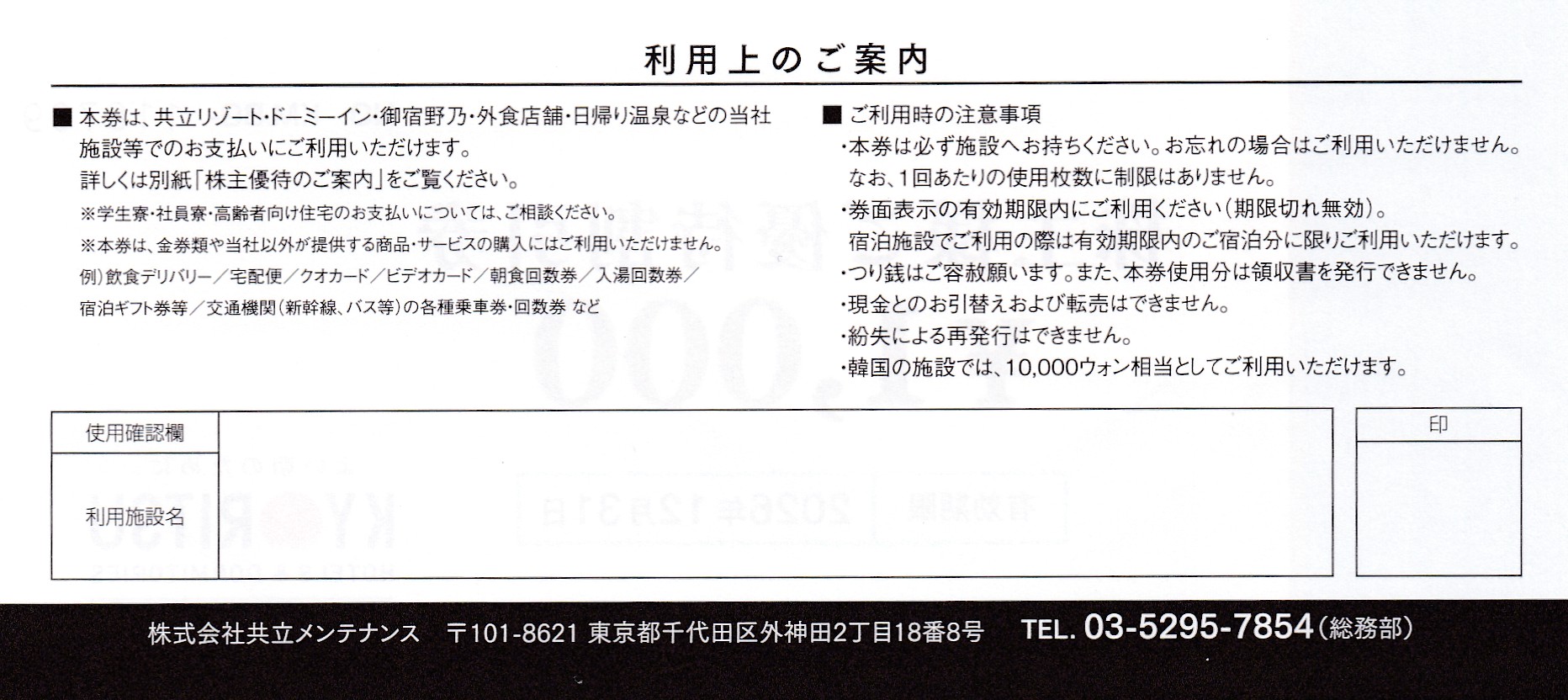 共立メンテナンス株主優待券(1,000円券)(2026.12.31)