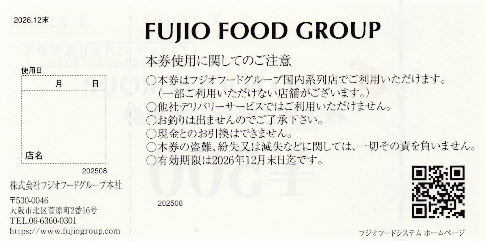まいどおおきに食堂(フジオフードグループ)株主優待券(500円券)(2026.12)