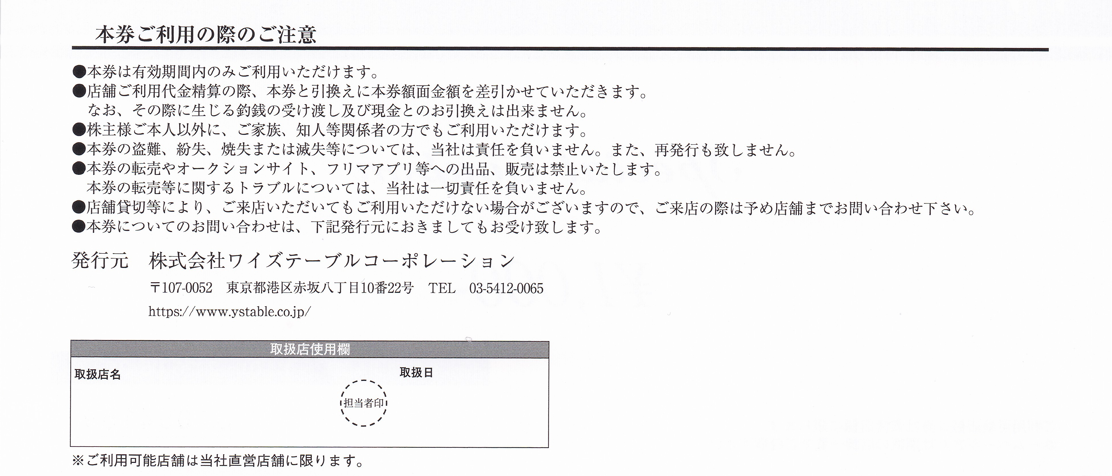 ワイズテーブルコーポレーション株主優待券(1,000円券)(2026.5.31)