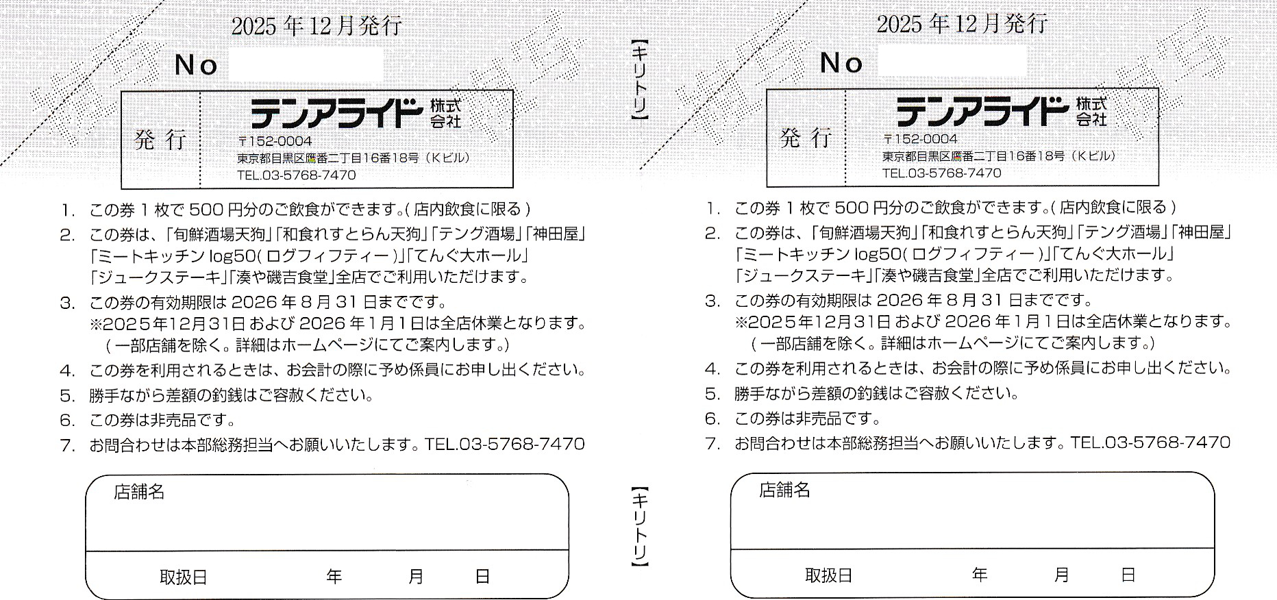 テング酒場(テンアライド)株主優待券(500円券)(2枚綴)(2026.8.31)