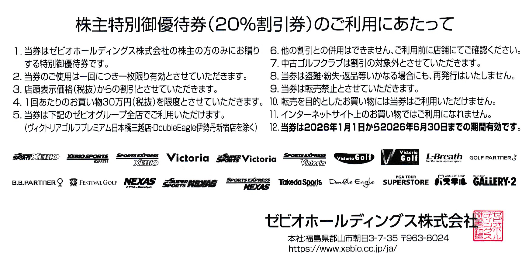 ゼビオ株主優待券(20%割引券)(ヴィクトリア他)(2026.6.30)