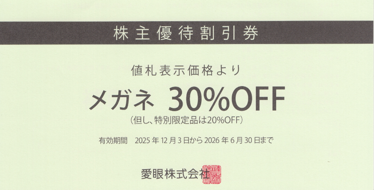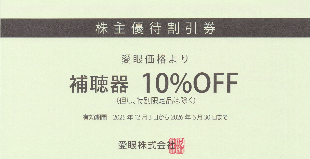 愛眼株主優待券(メガネ割引券1枚+補聴器割引券)(冊子)(2026.6.30)